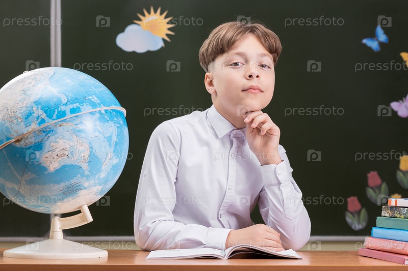 Красивый счастливый школьник сидит за столом