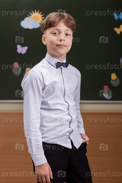 Красивый улыбающийся школьник в белой рубашке