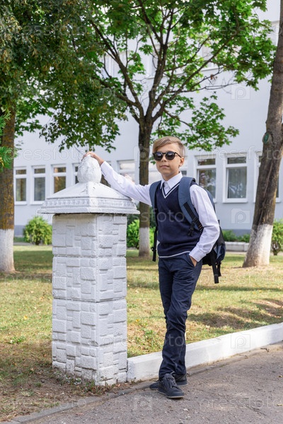 Счастливый мальчик в школьной форме, в белой рубашке, синем жилете и солнцезащитных очках с рюкзаком стоит возле школы