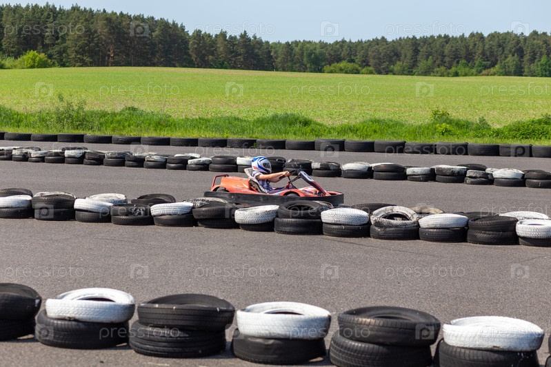 Молодежный картингист на трассе. Динамическое изображение подростка, быстро движущегося на картинге, с эффектом размытия изображения