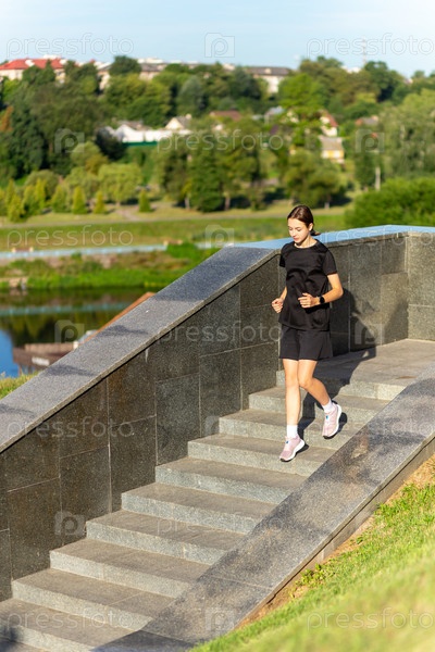 Молодая женщина в черной одежде бежит по лестнице на городской улице рано утром