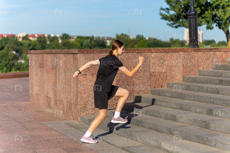 Молодая женщина в черной одежде бежит по лестнице на городской улице рано утром