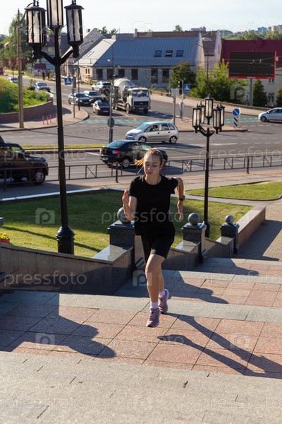 Молодая женщина в черной одежде бежит по лестнице