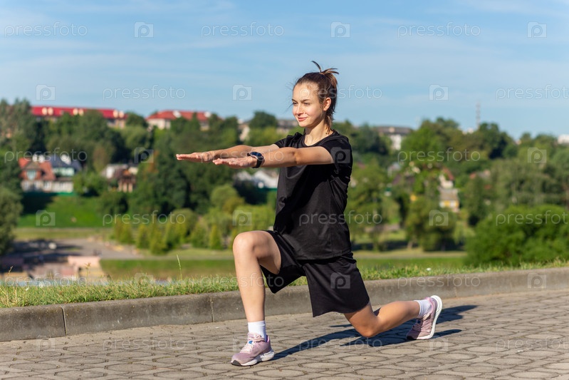 Молодая, подтянутая и спортивная девушка в черной одежде растягивается после тренировки в городском парке