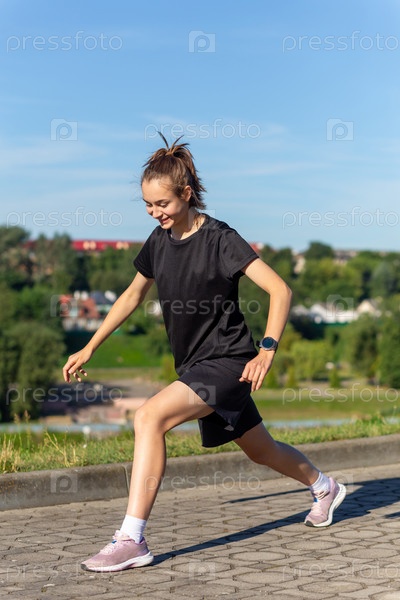 Молодая, подтянутая и спортивная девушка в черной одежде растягивается после тренировки в городском парке. Фитнес, спорт, городской бег и концепция здорового образа жизни