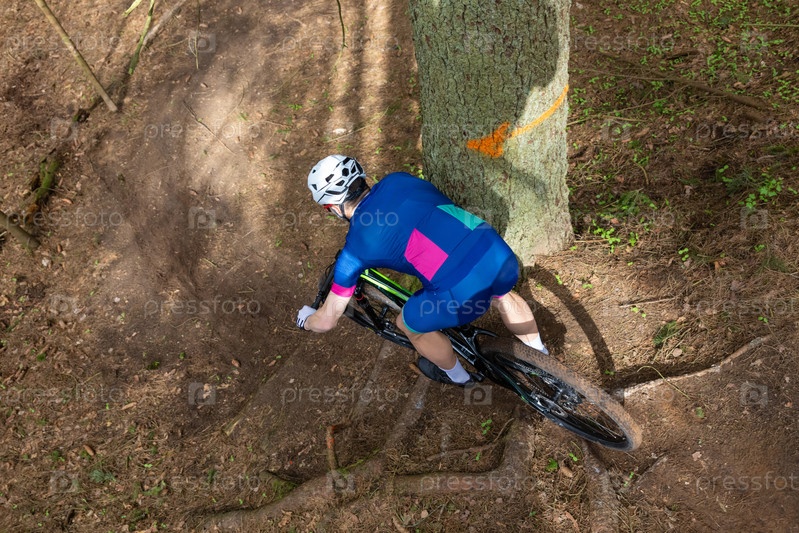 Мужчина едет на горном велосипеде по лесистой местности в летний день. Горный байкер спускается через сгоревший лес по трассе с корнями