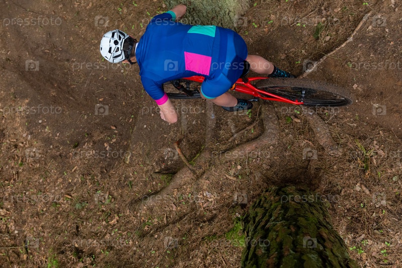 Мужчина едет на горном велосипеде по лесистой местности в летний день. Горный байкер спускается через сгоревший лес по трассе с корнями