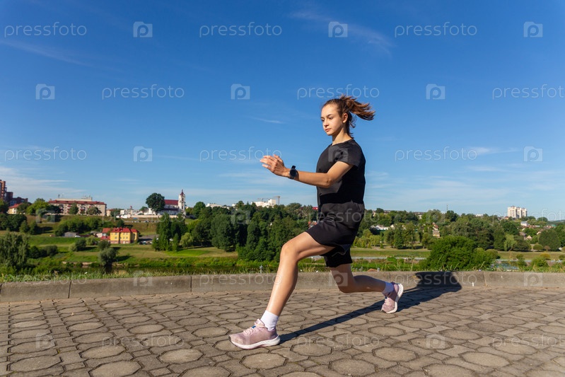 Молодая, подтянутая и спортивная девушка в черной одежде растягивается после тренировки в городском парке. Фитнес, спорт, городской бег и концепция здорового образа жизни
