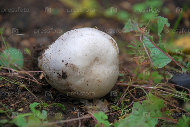 Мухомор бронзовый лежит на земле. На черной земле с скудной растительностью лежит вырванный с корнем белый ядовитый гриб. Гриб внешне похож на шампиньон, у него толстая ножка и шаровидная шляпка