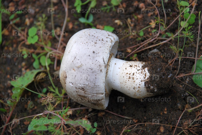 Мухомор бронзовый лежит на земле. На черной земле с скудной растительностью лежит вырванный с корнем белый ядовитый гриб. Гриб внешне похож на шампиньон, у него толстая ножка и шаровидная шляпка