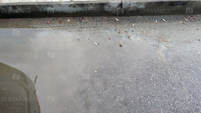Отражение серого неба в луже воды. На серой асфальтированной дороге рядом с обочиной после дождя образовалась небольшая лужа. Серое пасмурное небо отражается от поверхности воды