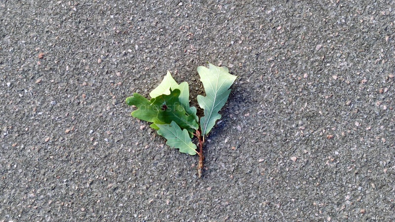 Упавшая дубовая ветка с зелеными листьями. На сером сухом асфальте лежит короткая коричневая ветка дерева с пятью зелеными удлиненными листьями. Дубовые листья начали подсыхать и немного скручиваться