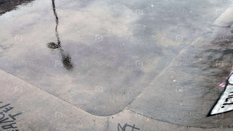 Отражение фонарного столба. Внутри серого бетонного скейтбординга на дне после дождя осталось небольшое количество воды. Уличный фонарный столб отражается от мокрой бетонной поверхности