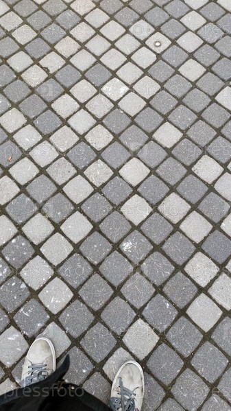 Бело-серая каменная кладка. Дорога вымощена дорожным камнем, часть камней темно-серая, часть светло-серая. Камни расположены в строгой последовательности, цвета случайны