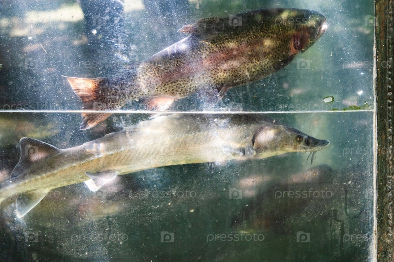 Несколько осетров и форелей плавают в открытом стеклянном бассейне