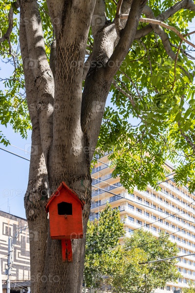 Красный деревянный скворечник на большом дереве в городе Ереван