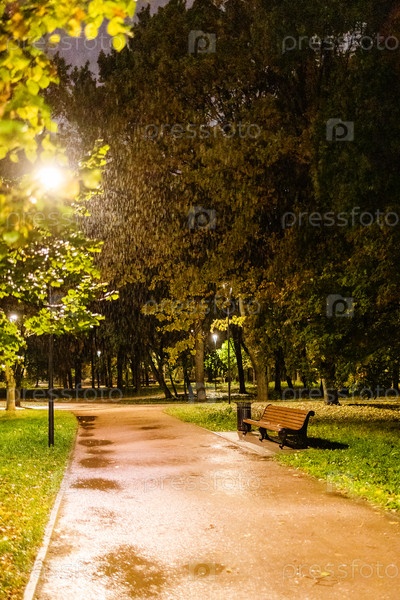 Мокрая деревянная скамейка в парке дождливой осенней ночью