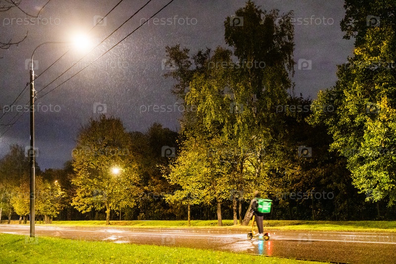 Курьер на электросамокате едет по мокрой дороге