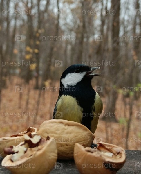 Синица радостно раскрыла клюв, кушая орех
