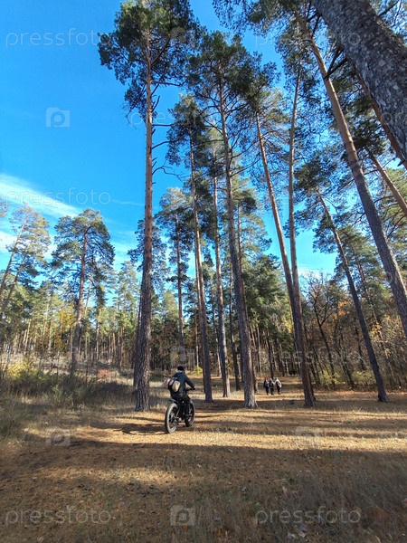 Человек на фэтбайке на прогулке в лесу солнечным днем осенью