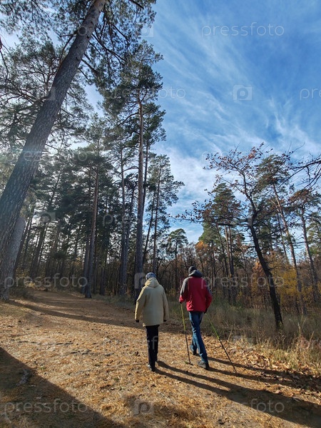 В лесу под соснами прогулка с лыжными палками