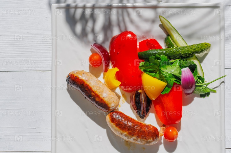 Жареные колбаски с овощами на белой тарелке в солнечный летний день