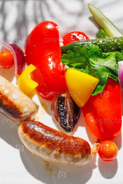 Жареные колбаски с овощами на белой тарелке в солнечный летний день