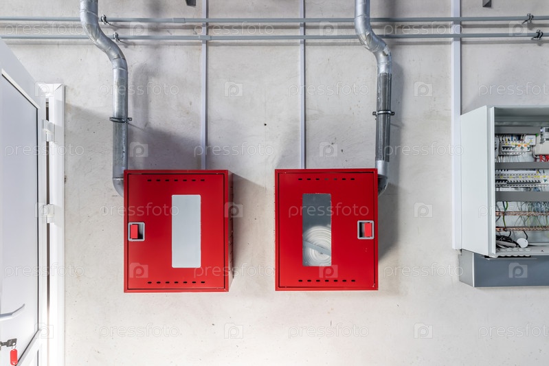 В коридоре многоквартирного дома установлен красный пожарный щит