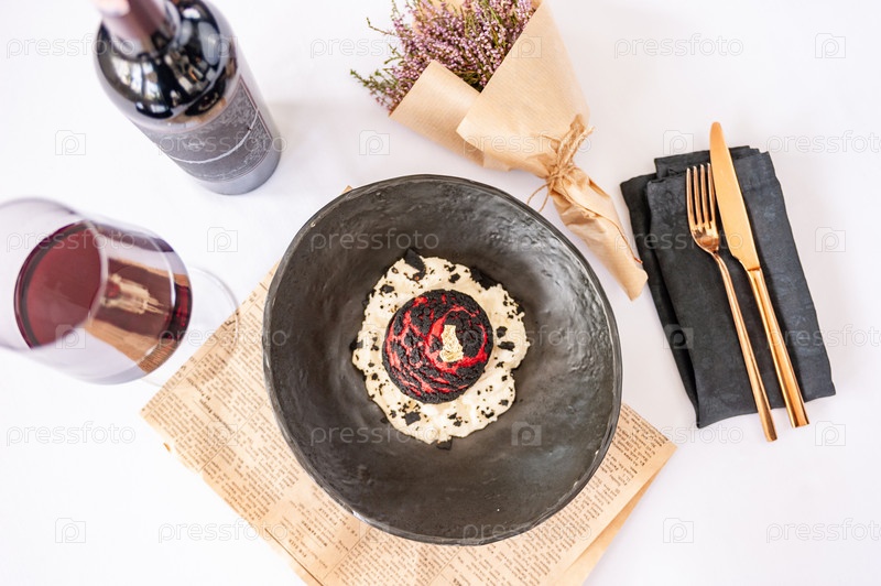 Булочка Шу Шу с говядиной, сливочным сыром, пармезаном эспума и чипсами Бородино