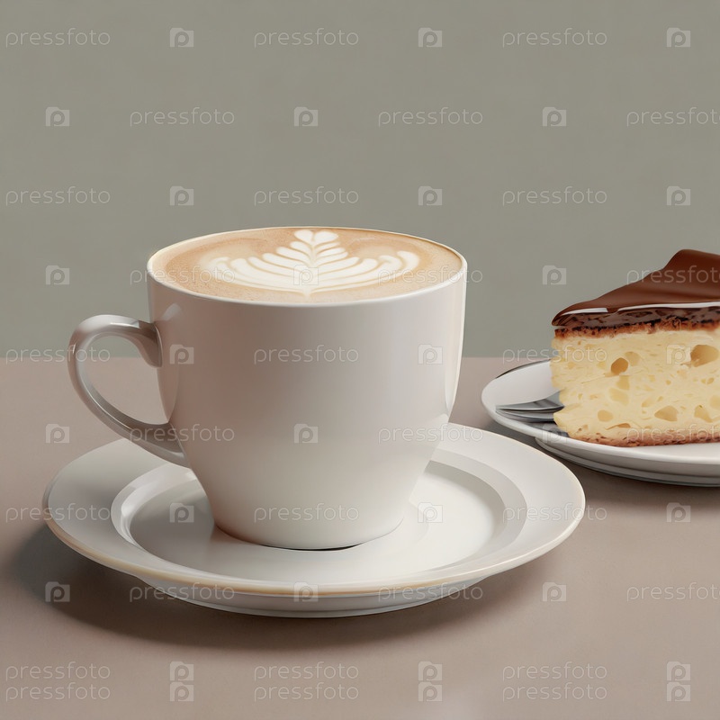Белая чашка кофе капучино рядом с тарелкой с кусочком торта со сливками на стеклянном белом столе