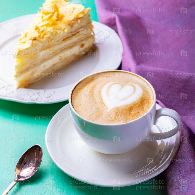 Белая чашка кофе капучино рядом с тарелкой с кусочком торта со сливками на стеклянном белом столе