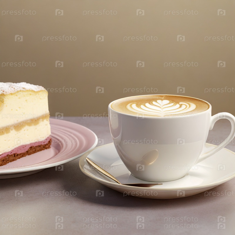 Белая чашка кофе капучино рядом с тарелкой с кусочком торта со сливками на стеклянном белом столе