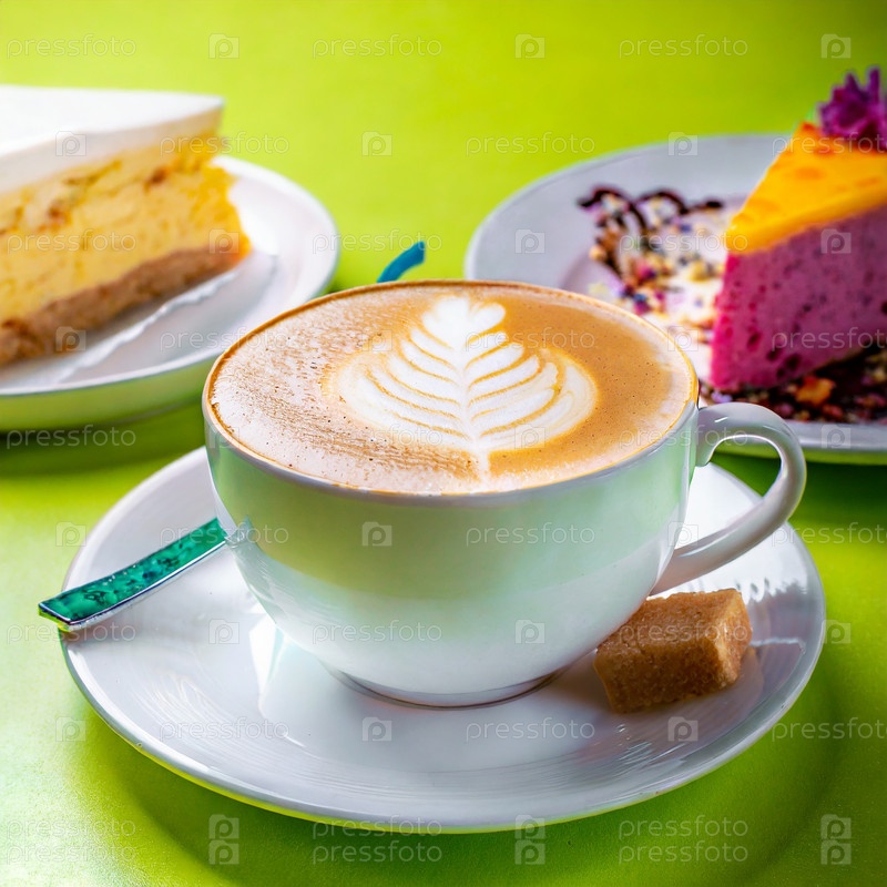 Белая чашка кофе капучино рядом с тарелкой с кусочком торта со сливками на стеклянном белом столе
