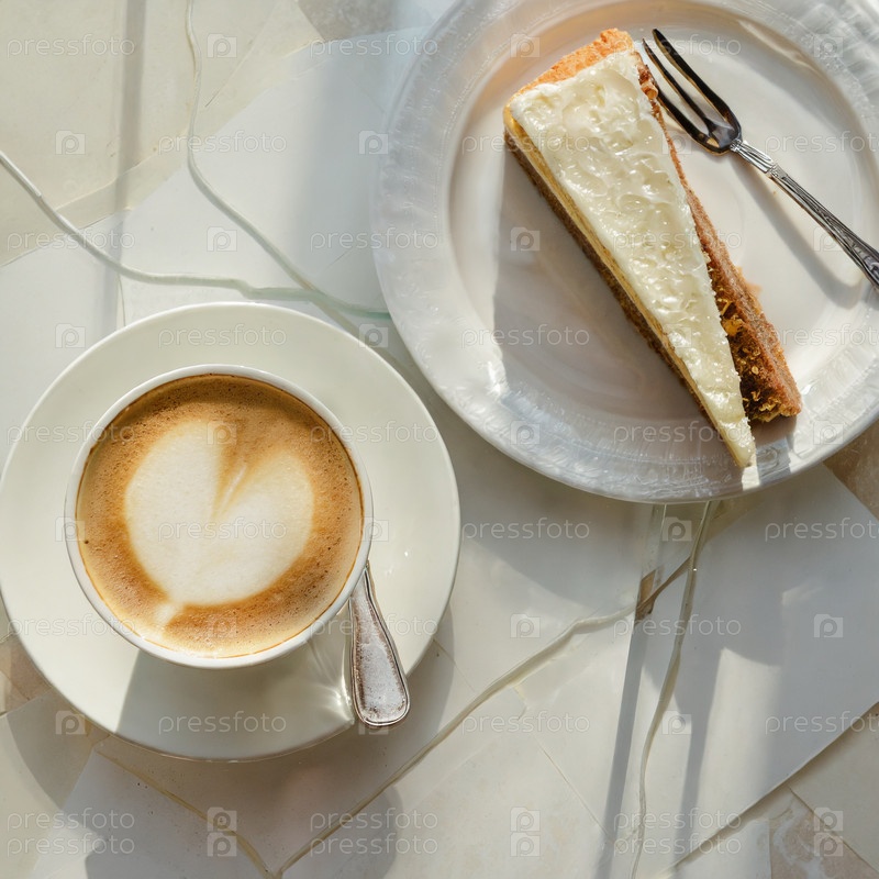 Белая чашка кофе капучино рядом с тарелкой с кусочком торта со сливками на стеклянном белом столе