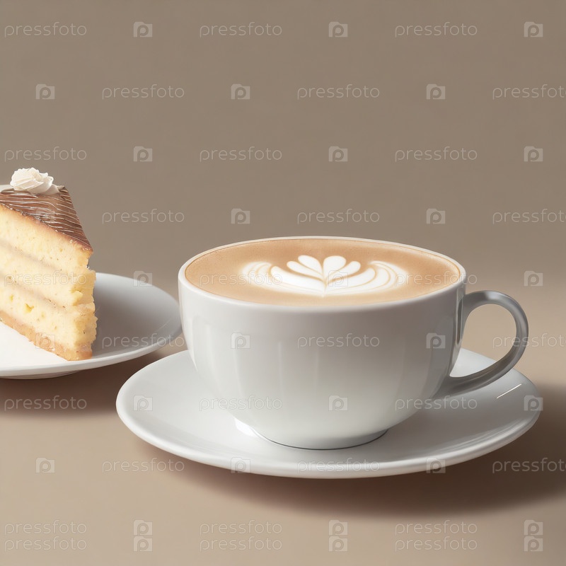 Белая чашка кофе капучино рядом с тарелкой с кусочком торта со сливками на стеклянном белом столе