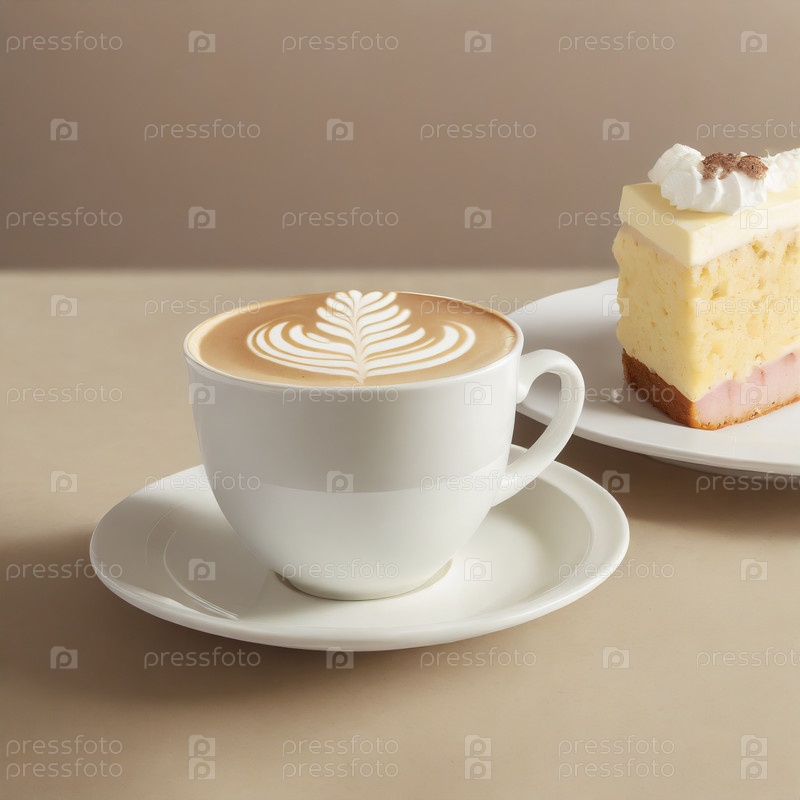 Белая чашка кофе капучино рядом с тарелкой с кусочком торта со сливками на стеклянном белом столе