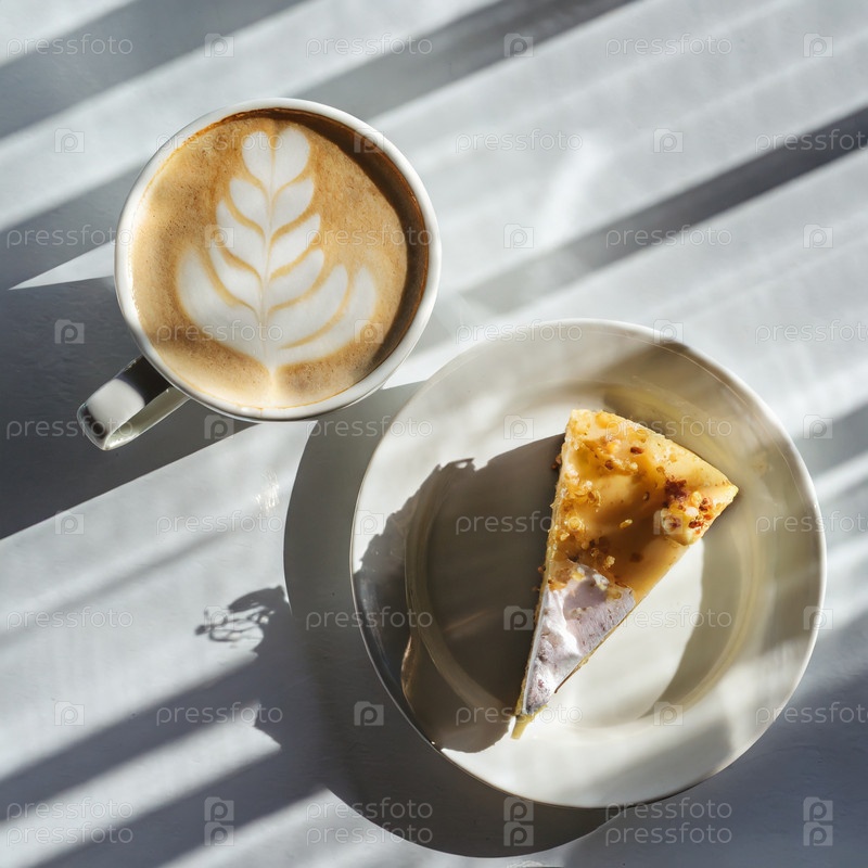 Белая чашка кофе капучино рядом с тарелкой с кусочком торта со сливками на стеклянном белом столе