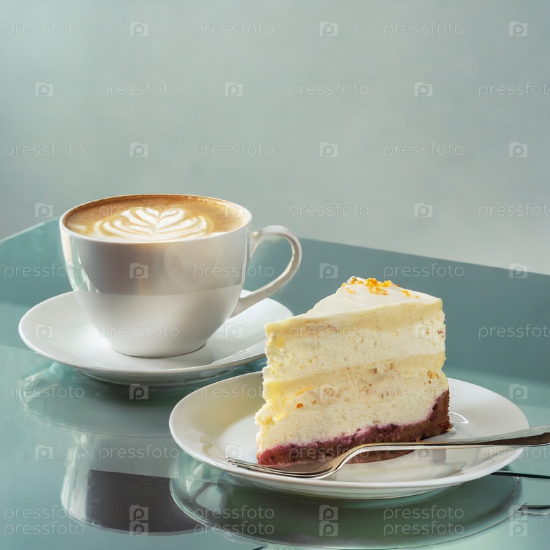 Белая чашка кофе капучино рядом с тарелкой с кусочком торта со сливками на стеклянном белом столе