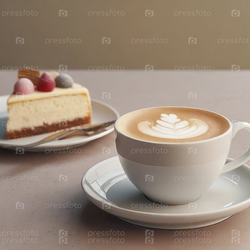 Белая чашка кофе капучино рядом с тарелкой с кусочком торта со сливками на стеклянном белом столе