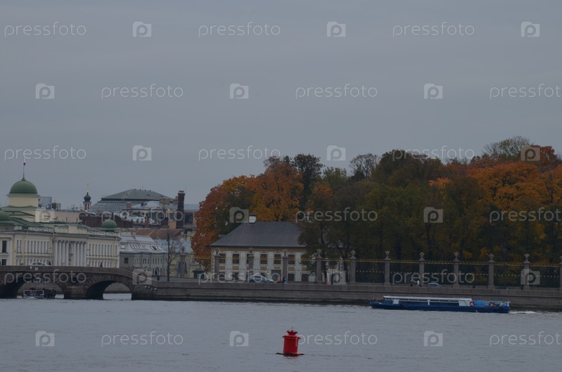 Вид на осенний Летний сад, Летний дворец, Прачечный мост и историческую застройку нгабережной реки Фонтанки в Санкт-Петербурге