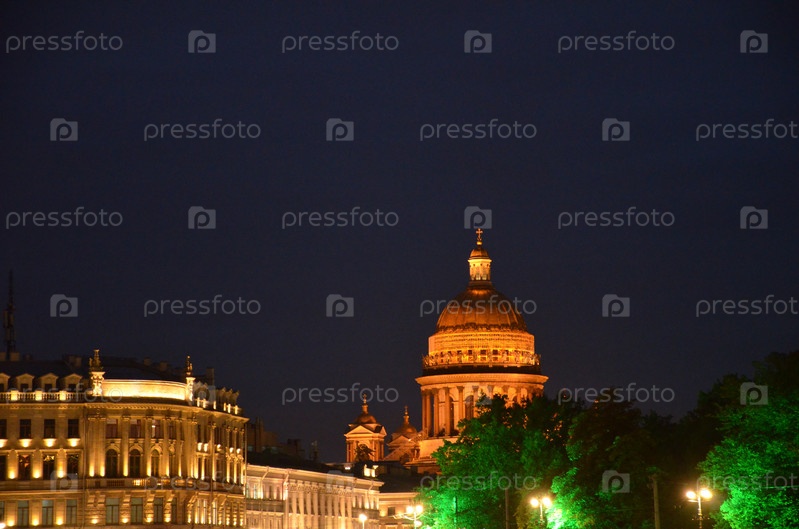 Ночной вид на Исаакивеский собор, Александровский сад и историческую застройку центра Санкт-Петербурга со стороны Дворцовой площади