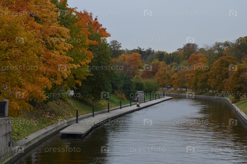 Осенний вид на реку Карповка в Санкт-Петербурге, понтон, разноцветные деревья, спокойная вода