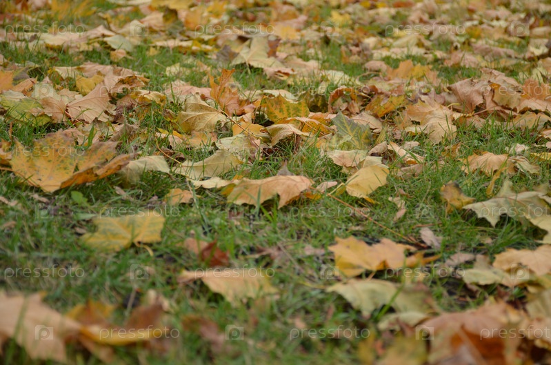 Осенние кленовые листья на зеленом газоне, листопад: фоновое изображение
