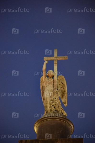 Ангел Алексанровской колонны в Санкт-Петербурге на фоне темно-синего вечернего неба