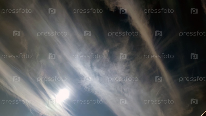 На небе высокие перистые облака. На светло-голубом небе висят белые продолговатые полупрозрачные облака. Они словно размазаны по всей длине неба. Солнце светит за облаками