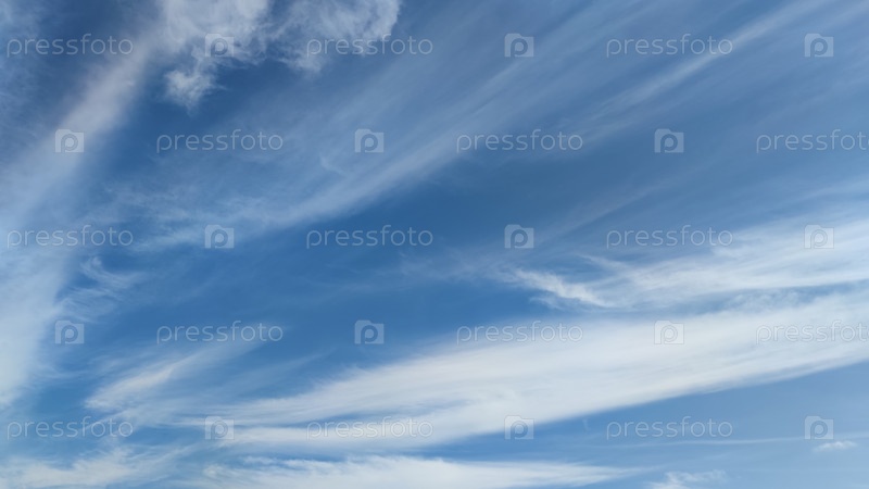 На небе высокие перистые облака. На светло-голубом небе висят белые продолговатые полупрозрачные облака. Они словно размазаны по всей длине неба. Солнце светит за облаками