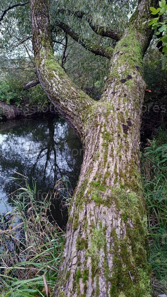 Небольшая речка с заросшими берегами. Спокойная гладкая вода в узкой реке. Свет неба отражается от воды. На берегу под углом растет старое большое дерево, его ствол покрыт зеленым мхом