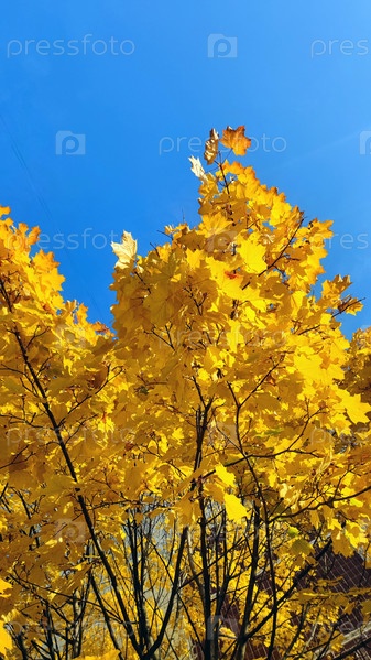 Кленовые ветки на фоне голубого неба. Ярко-желтые и оранжевые кленовые листья свисают с черных ветвей. Над листьями видно голубое безоблачное небо. Осенний ясный день