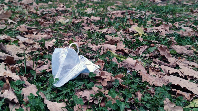Одноразовая защитная медицинская маска. Опавшие коричневые дубовые листья лежат на зеленой подстриженной лужайке. Среди листьев дерева лежит использованная одноразовая медицинская маска