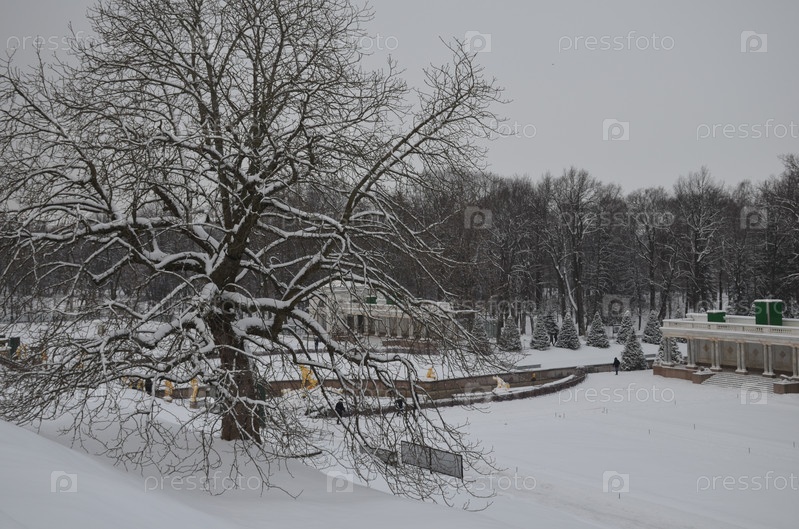 Нижний парк Петергофа зимой: вида на фонтан Самсон, Морской канал и Воронихинские колоннады